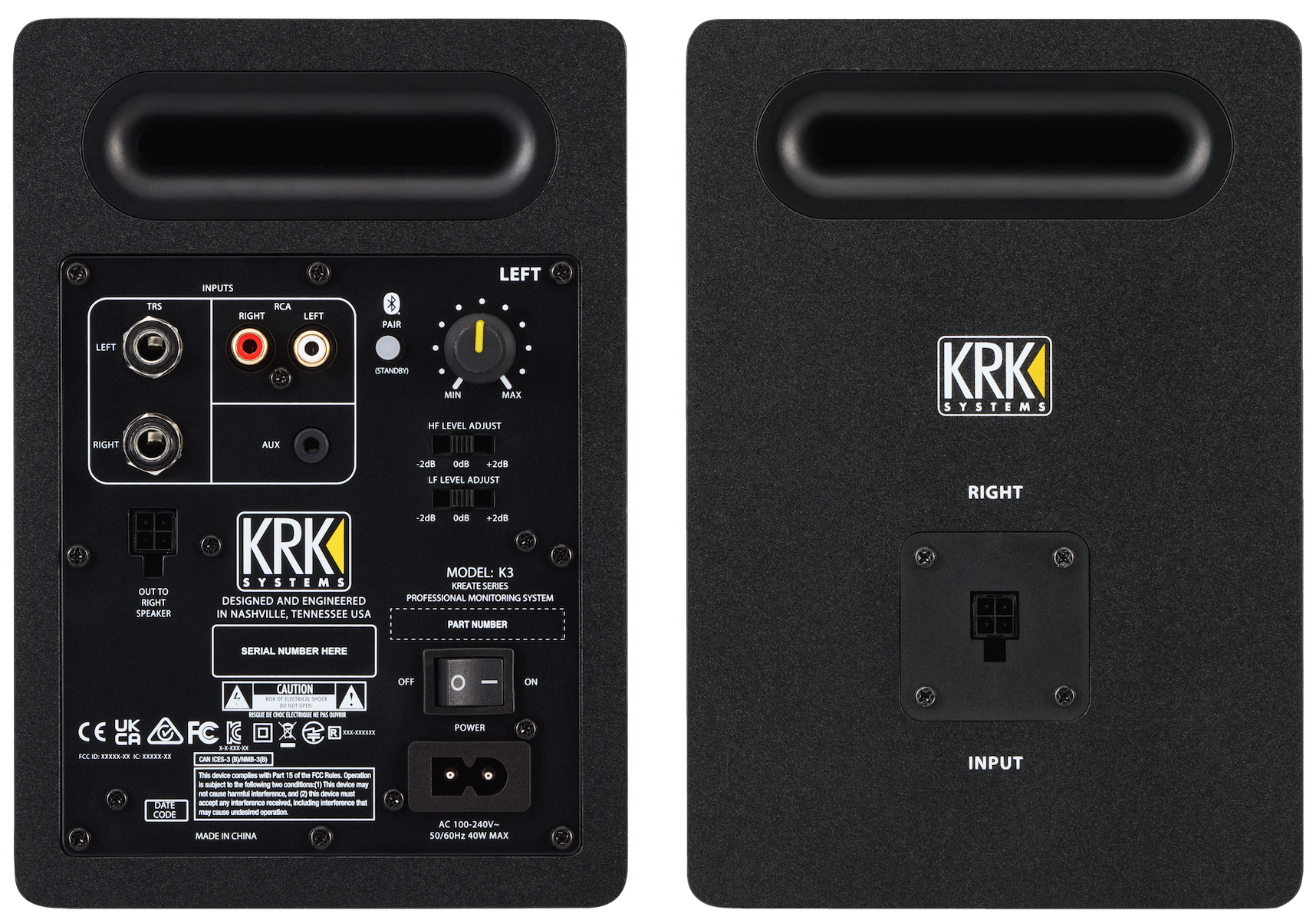 System Type: Active Studio Monitor Pair (Left Active Right Passive) AC Input Voltage: 100 - 240VAC (+ - 10%), 50/60Hz